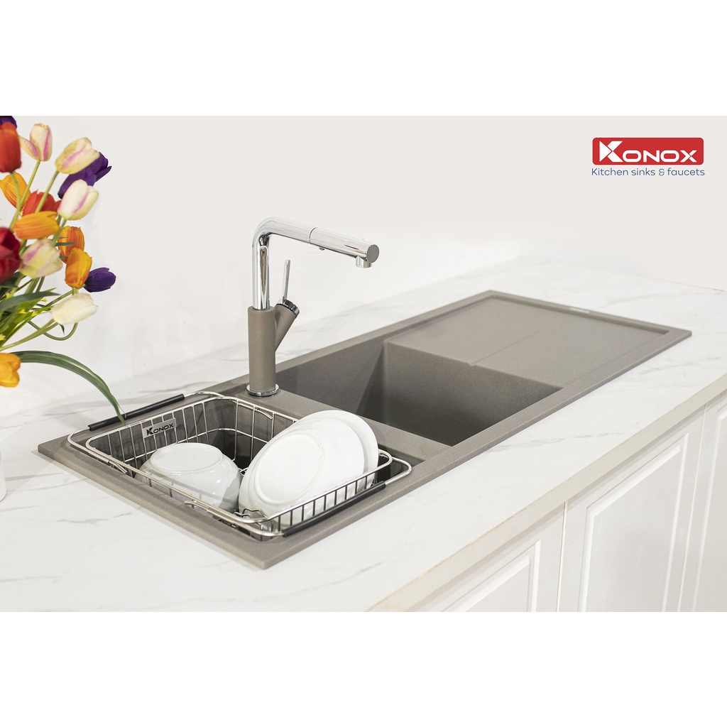 Giới thiệu Chậu rửa bát đá KONOX Granite Series Livello 1160 Grey, Made in Italy, Full set gồm Siphon + Giá úp bát inox
