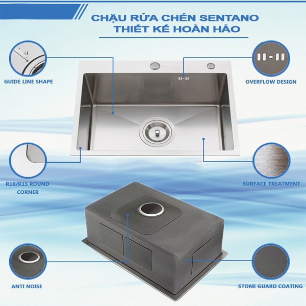 - Bề mặt ngoài của chậu rửa chén được phủ lớp sơn tĩnh điện giúp tăng độ bền mặt ngoài chống bám mốc. Đồng thời ở đáy chậu phía mặt ngoài có tấm cao su đệm chống ồn tiếng khi sử dụng vòi nước.