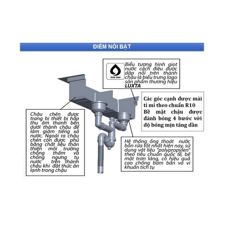Chậu rửa chén cao cấp Luxta inox304 LC8046-3.0, chậu dày 3mm, chống ồn, bảo hành 05 năm>Kiểu dáng sang trọng, Inox 304 dày 3mm