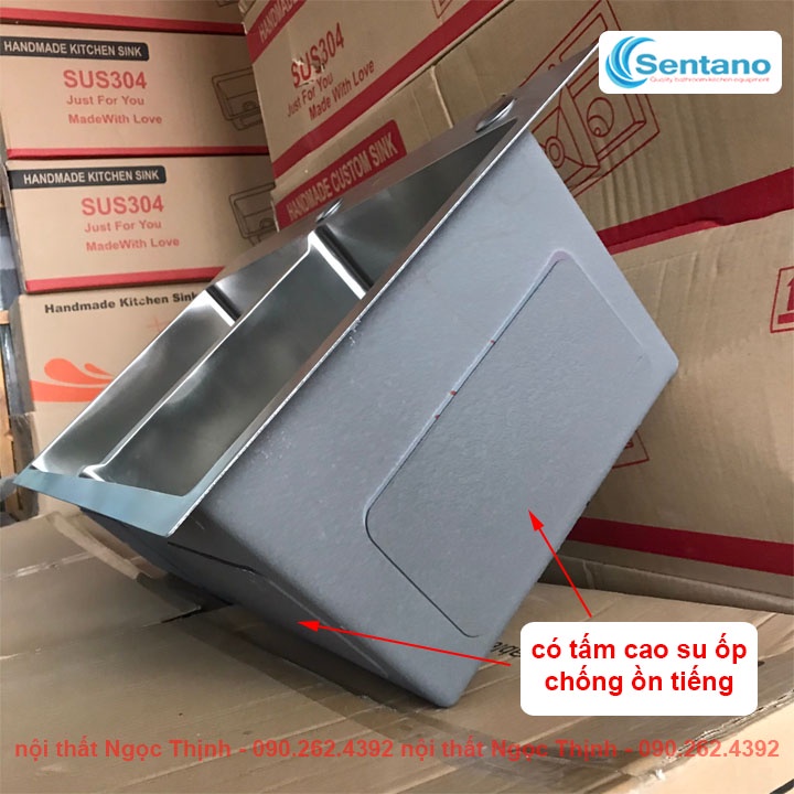 * Xung quanh bề mặt ngoài của chậu rửa chén được ốp tấm cao su chống ồn, vì vậy nên khi nước xả xuống bồn chậu không bị vọng tiếng, không bị ồn.