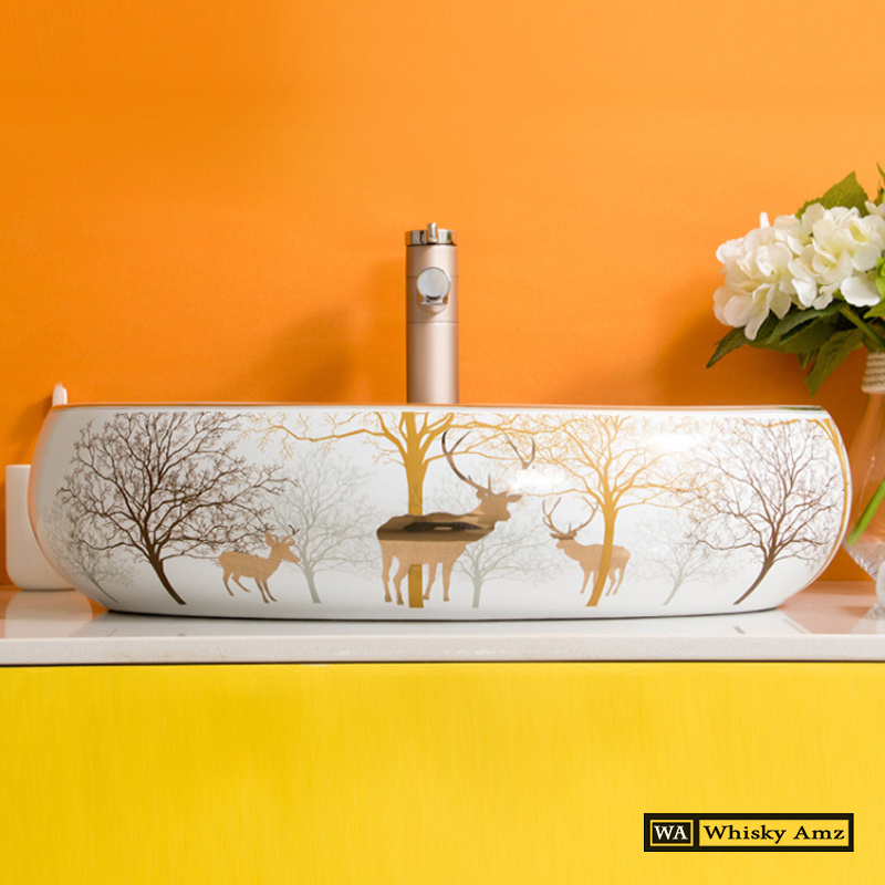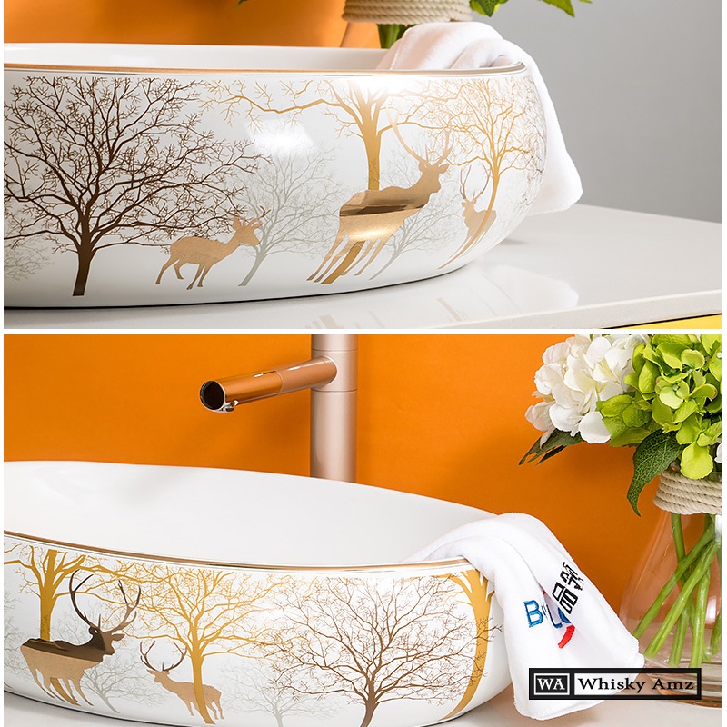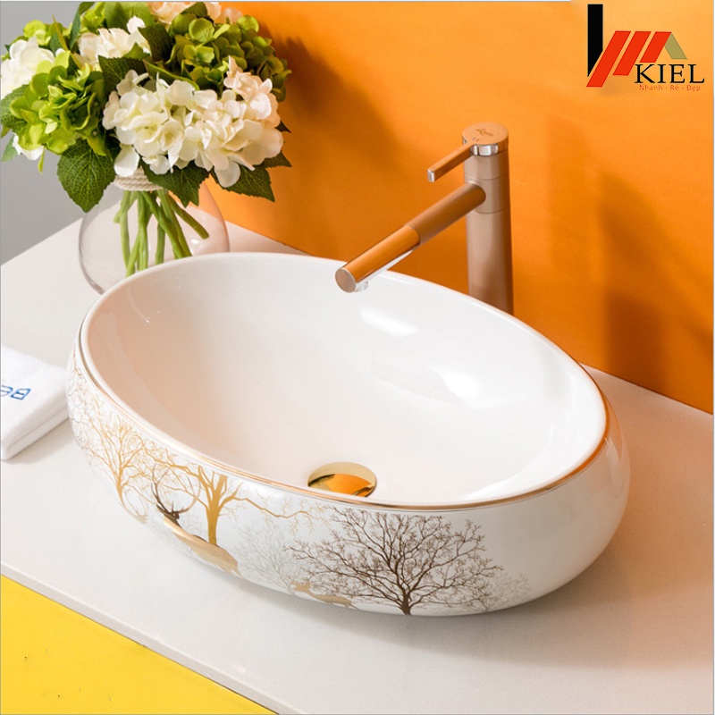 Chậu rửa mặt elip - lavabo elip hươu vàng đặt bàn sang trọng bảo hành 10 năm men sứ .