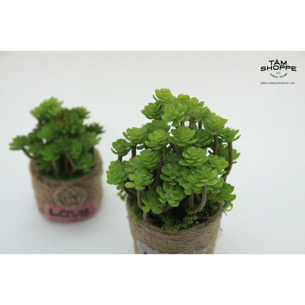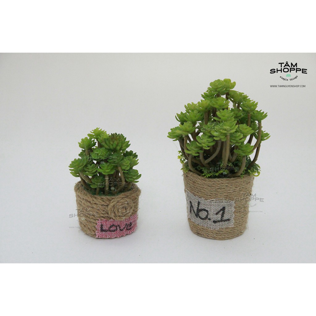 - Chất liệu: Hoa nhựa cao cấp, chậu dây thừng handmade