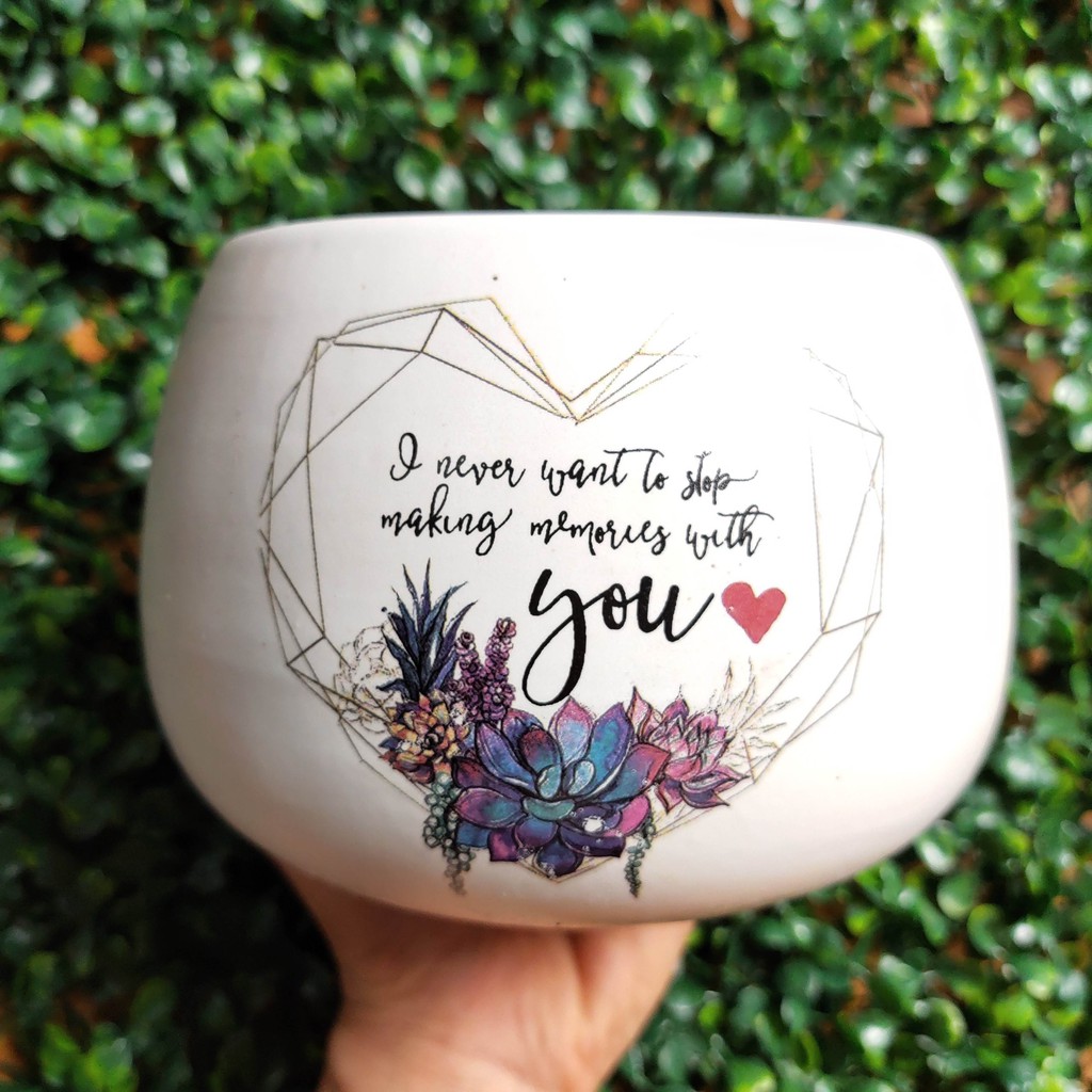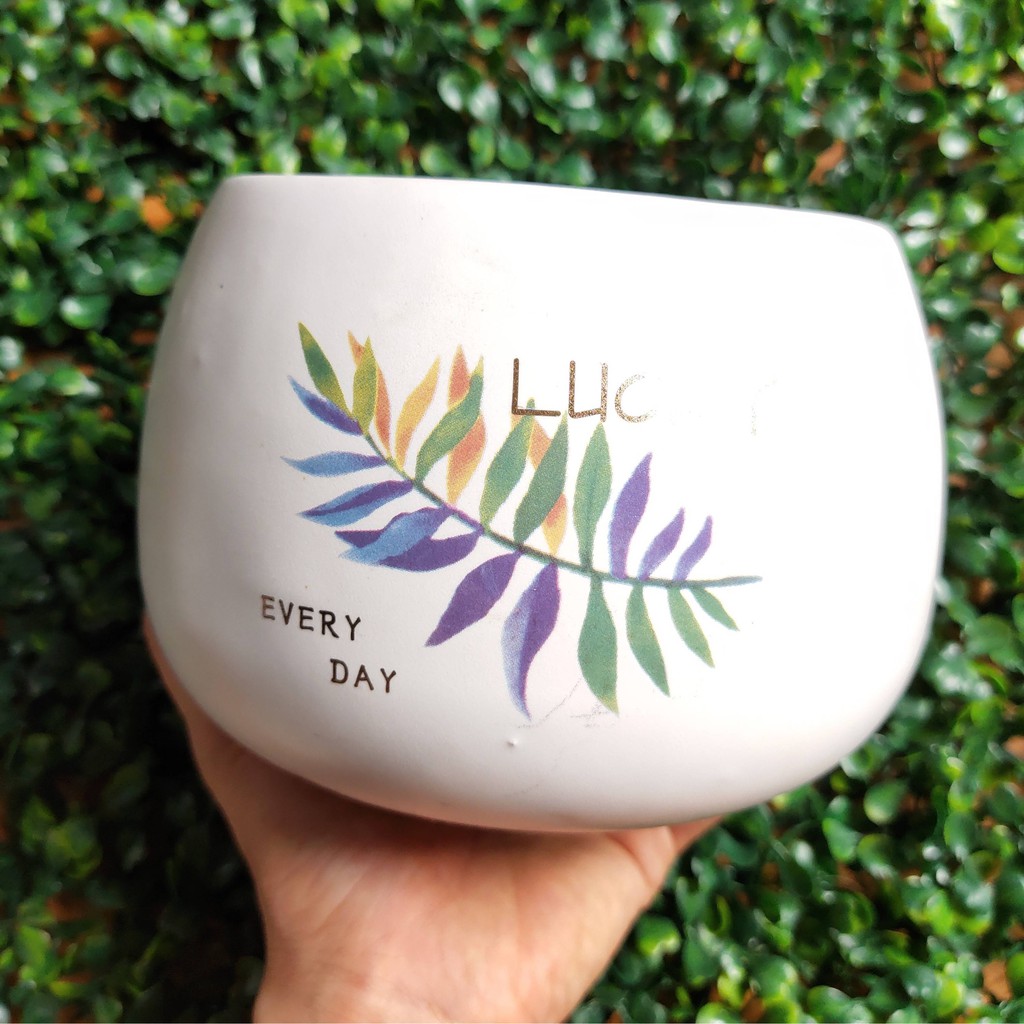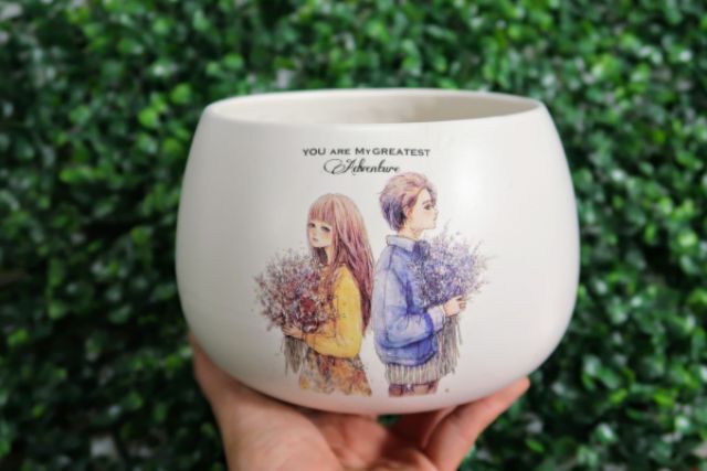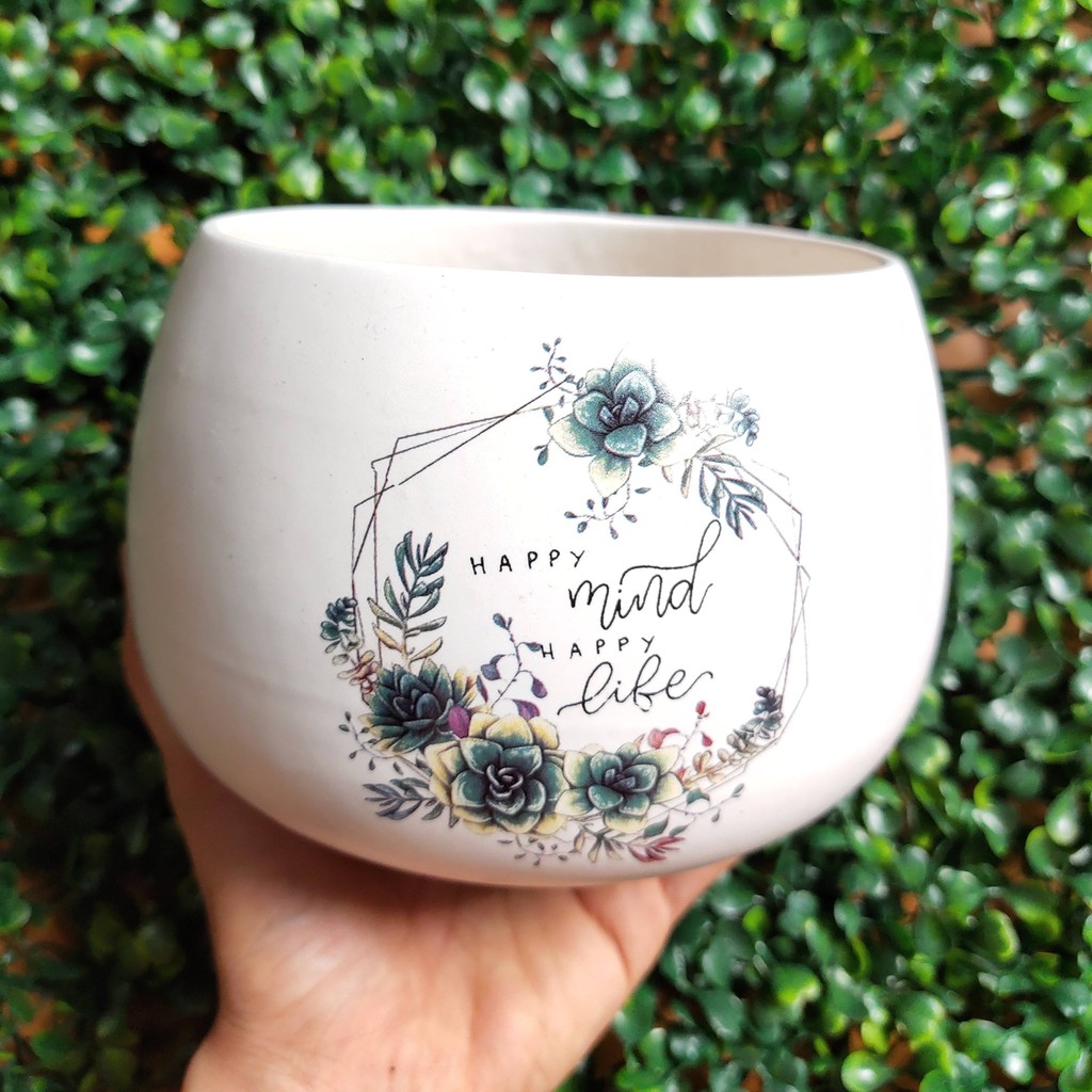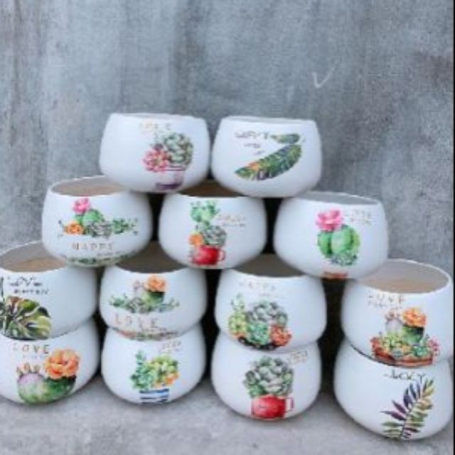 Chậu trồng cây hình tròn hạt dẻ size trung, có in hình, men sứ trắng, có lỗ thoát nước.