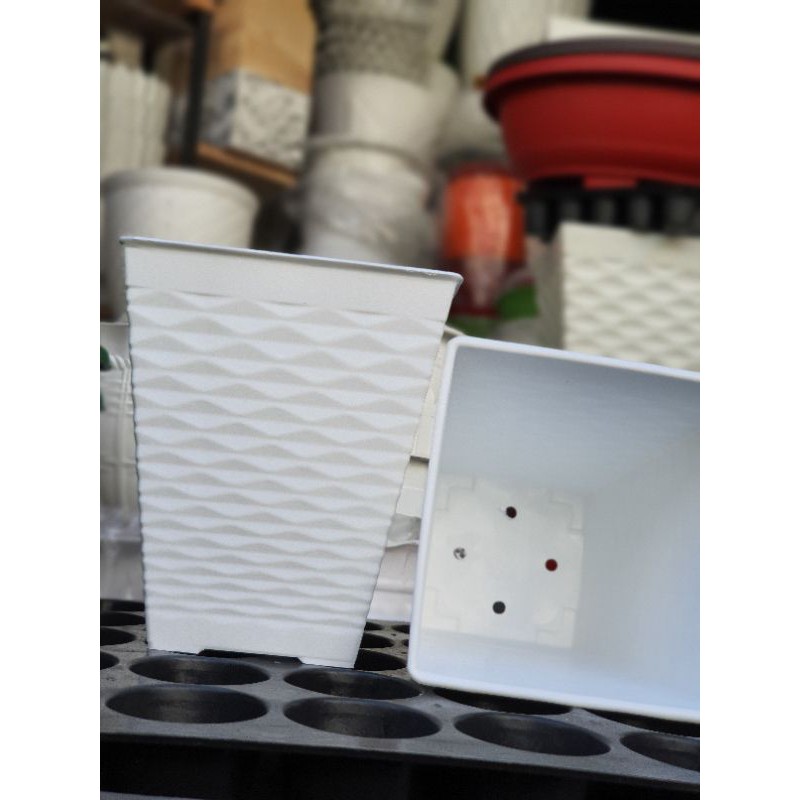 chậu nhựa vuông, hoa văn là những gợn sóng lăn lăn mềm mại, nhẹ nhàng.chậu có đường kính vuông 17cm, cao 20cm. chất nhựa nguyên sinh rất bền chắc. Bề mặt chậu sáng bóng rất dễ vệ sinh.
