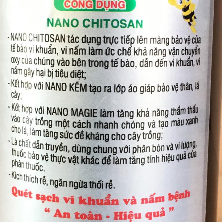 Chitosan là sản phẩm hữu cơ được chiết xuất hoàn toàn từ vỏ tôm cua (chứa chitin), được tách chiết thành chitosan. Nano Chitosan tác dụng trực tiếp lên màng bảo vệ của tế bào vi khuẩn, vi nấm làm ức chế khả năng vận chuyển oxy của chúng vào bên trong tế bào, dẫn đến vi khuẩn, vi nấm bị tiêu diệt. NANO CHITOSAN kết hợp với Nano Kẽm như một lớp áo giáp bảo vệ cây trồng, tránh sự xâm nhập của nấm, khuẩn. Kết hợp với Nano Magie giúp cây trồng xanh lá, tăng cường quá trình quang hợp tạo sức đề kháng tự nhiên, giúp cây mau hồi phục. Là chất dẫn truyền, dùng chung với phân bón và vi lượng, thuốc bảo vệ thực vật khác để làm tăng tính hiệu quả của phân thuốc. Kích thích rễ, ngăn ngừa thối rễ.