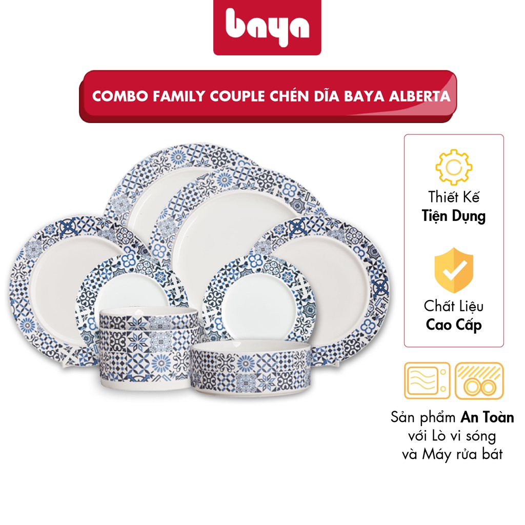 - Bộ chén (bát) đĩa gia đình 9 món gồm tô, chén (bát), đĩa BAYA ALBERTA, chất liệu sứ trắng men bóng cao cấp, họa tiết gạch bông màu xanh kiểu dáng retro mang một phong cách hoài cổ nhưng cũng không kém phần hiện đại, độ bền cao, bề mặt nhẵn đẹp, dễ dàng rửa sạch.