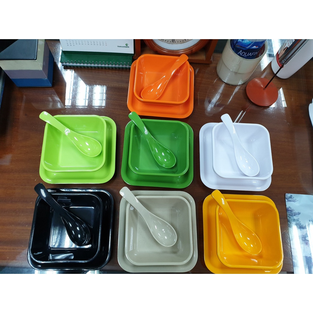 Bộ chén, dĩa vuông đựng chè và muỗng nhựa Melamine đủ màu(TV96+DV96+MCNo25)Bộ gồm 01 chén vuông, 01 dĩa lót vuông và 01 muỗng