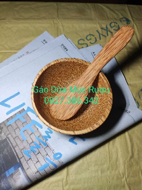 Chén gỗ dừa kích thước 12cm, cao 5.5cm.Que trộn bột gỗ dừa kích thước dài 18cm, bản rộng 4.2cm.