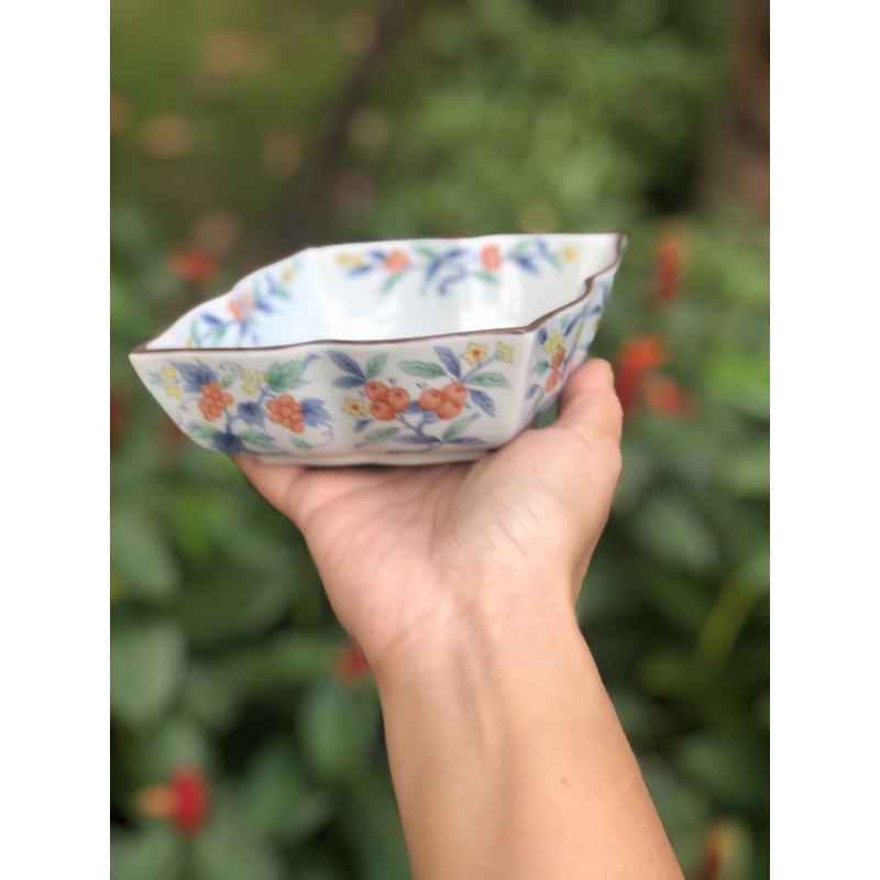 Thố gốm sứ Nhật gốm ngũ sắc dạng chén hình thoi rất ấn tượng.Kích thước D17cm N14cm C5cm.