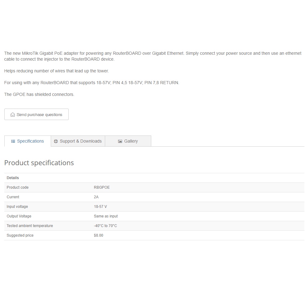 The new MikroTik Gigabit PoE adapter for powering any RouterBOARD over Gigabit Ethernet. Simply connect your power source and then use an ethernet cable to connect the injector to the RouterBOARD device.Helps reducing number of wires that lead up the tower.