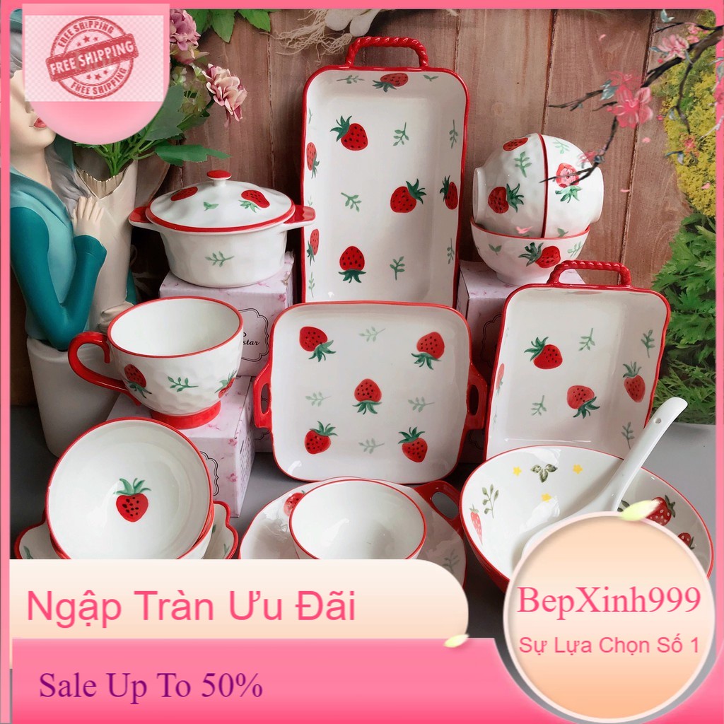 Chén Sứ Bát Ăn Cơm Bộ Bát Đĩa Decor Chén Dĩa Sứ Dâu Tây Hồng Dễ Thương Cute Cao Cấp B48