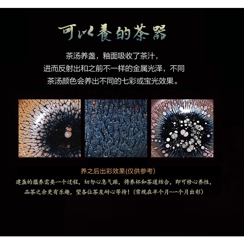 + Chén Thiên Mục được chế tác hoàn toàn thủ công từ tạo hình đến kéo phôi đều do đôi bàn tay hoàn thành, tỉ mỉ cẩn thận. Diêu biến (Biến hóa kỳ ảo từ lò nung) vô cùng khéo léo, 1 do chế tác, 2 do công phu, điều lửa điêu luyện, tự nhiên trở thành kẻ chế tác thuần thục nhất, sắc màu không trùng lặp.