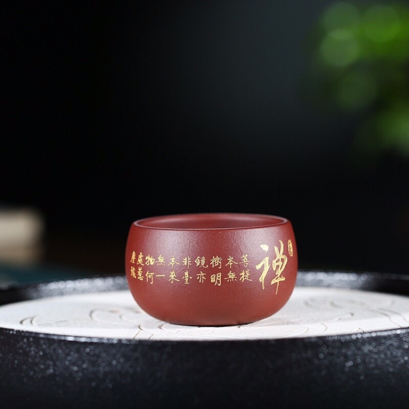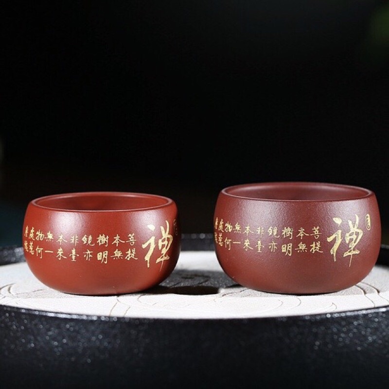 Chén trà khắc chữ Thiền dát nhủ vàng.—Chất đất: Daihongpao và Giáng Ba Nê