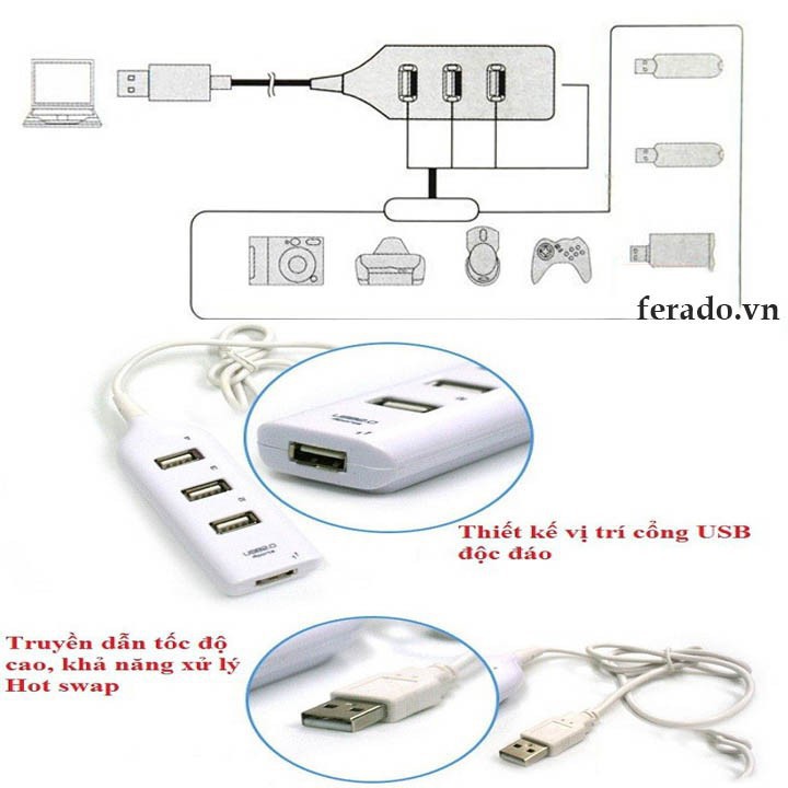 USB hub 4 portGiao diện chuẩn USB 2.0, 4 port plug and play tốc độ cao. Hỗ trợ cắm nóng - hot-swappable.