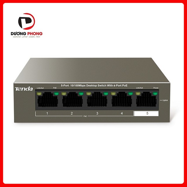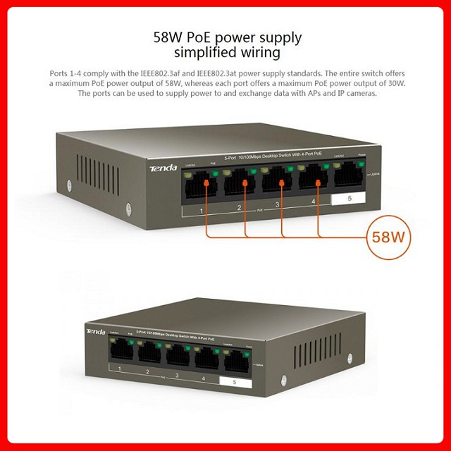 - Swicht PoE Tenda cung cấp 5 cổng RJ45 10/100 Mbps Base-TX. Truyền tải khoảng cách lên đến 250 mét, vượt qua giới hạn truyền tải hiện tại hàng trăm mét. Bảo vệ chống sét 6KV Switch PoE là switch giám sát thực sự. Cổng 1-4 hỗ trợ chuẩn IEEE 802.3at và chuẩn IEEE 802.3af PoE. Nó cung cấp công suất đầu ra PoE tối đa 30W trên mỗi cổng và 63W trên toàn bộ thiết bị.
