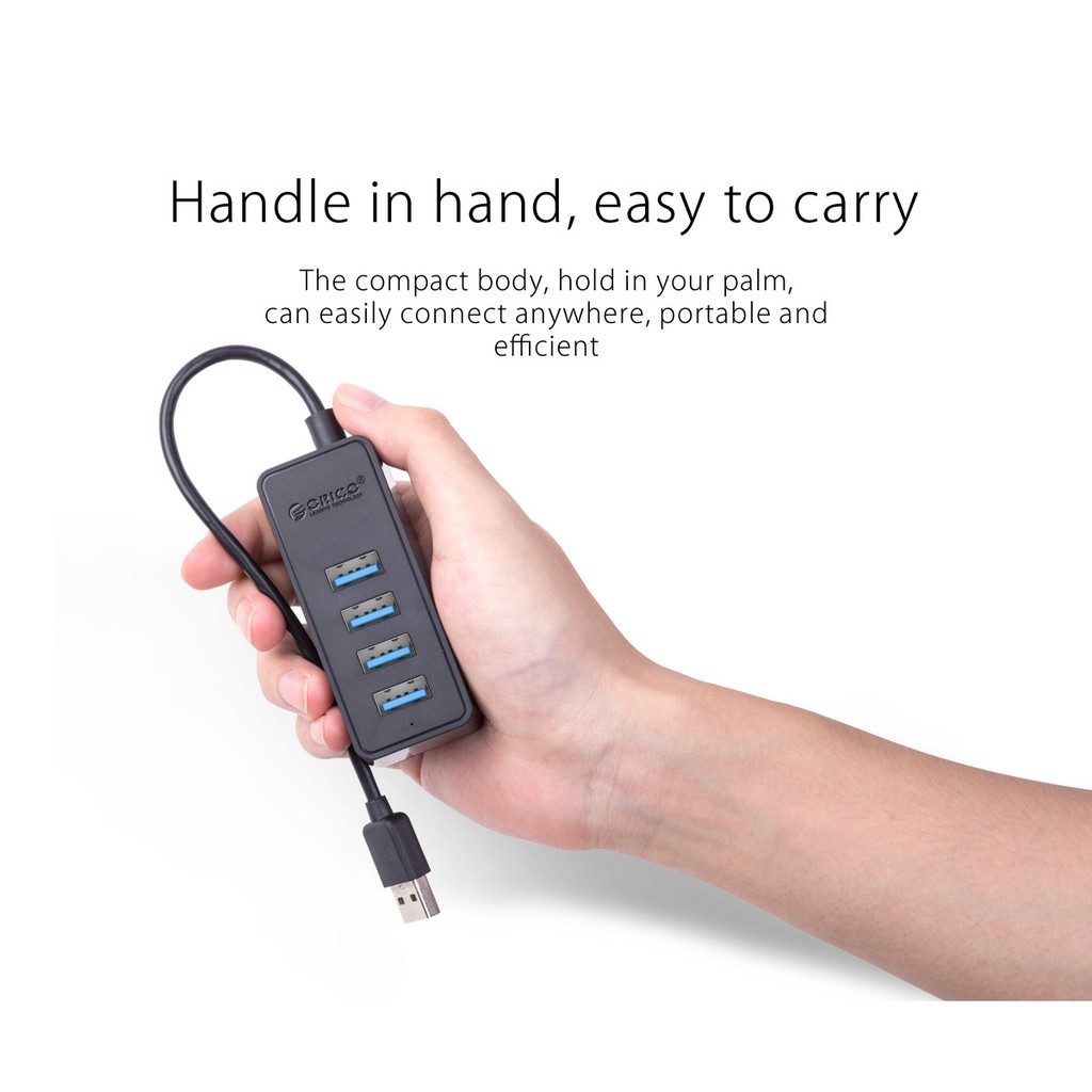 Hub USB 3.0 Orico 4 Cổng W5P-U3 được thiết kế từ chất liệu nhựa an toàn, kích thước nhỏ gọn giúp bạn cầm nắm và dễ dàng bỏ túi, balo để di chuyển. Chiều dài cáp 0.3 mét giúp bạn sử dụng thiết bị trong phạm vi gần như kết nối điện thoại, laptop, bàn phím, webcam...