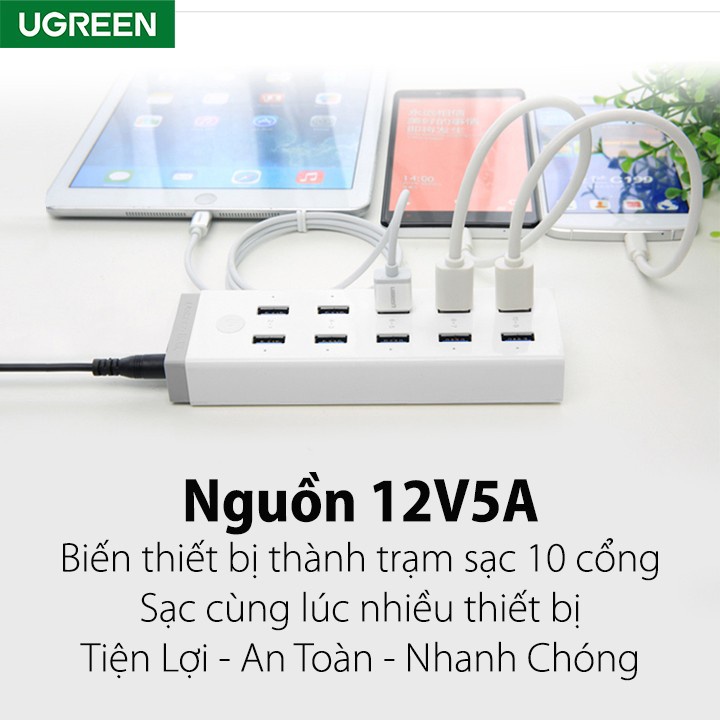 Bộ Chia USB 3.0 10 Cổng Cao Cấp Có Nguồn rời 12V-4A Ugreen 20297 - Hàng Chính Hãng