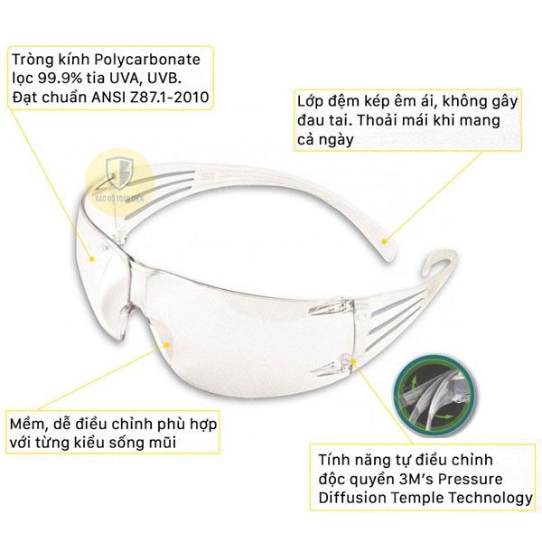 Kính bảo hộ 3M áp dụng công nghệ 3M™ Pressure Diffusion Temple với thiết kế phần gọng có độ đàn hồi cao, ôm khít vào đầu người mang, giảm tình trạng kính bị xê dịch khi đang làm việc.