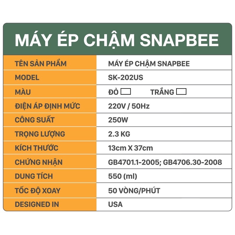 Giới thiệu [CHÍNH HÃNG] Máy Ép Chậm Snapbee SK-202US
