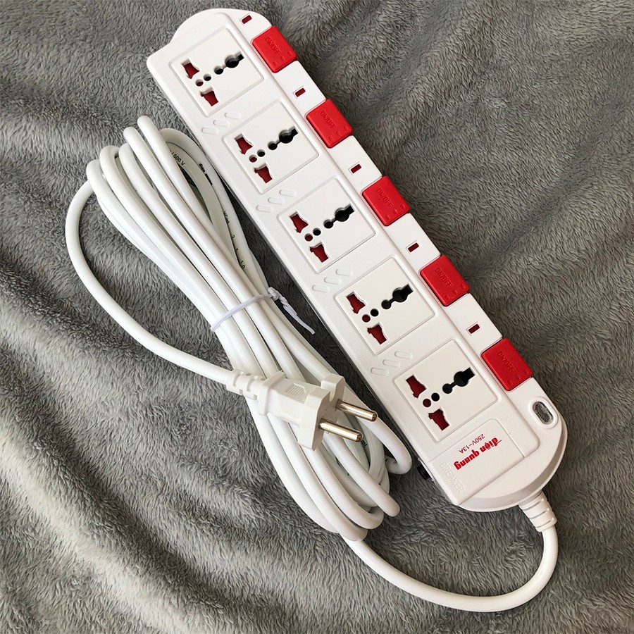 - Số ổ cắm: 5 ổ cắm 3 chấu đa năng (cắm được các loại phích cắm phi 4, phi 5, dẹp, 3 chân thẳng nhỏ... )