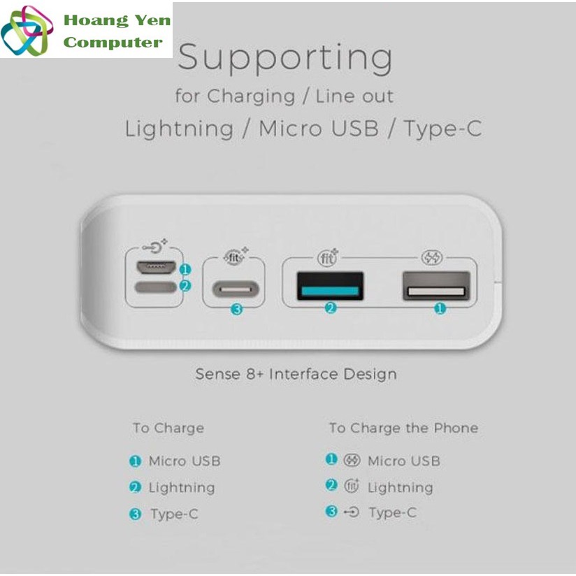 + 3 cổng sạc vào hổ trợ Quick Charge 2.0 (Micro usb, Type C), bạn có thể dùng cáp IPhone / Micro usb / Type C đều sạc được cho pin này.