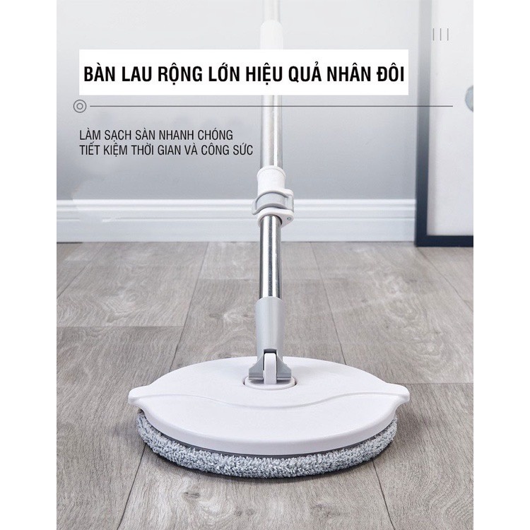 – Bàn lau hình tròn, đường kính 25cm có thể xoay 360 độ tiện lợi, bàn lau to giúp lau nhanh hơn và hiệu quả hơn. Giẻ lau chất liệu microfiber rất dày thấm hút nước cực tốt, hút bụi và lông tóc hiệu quả.