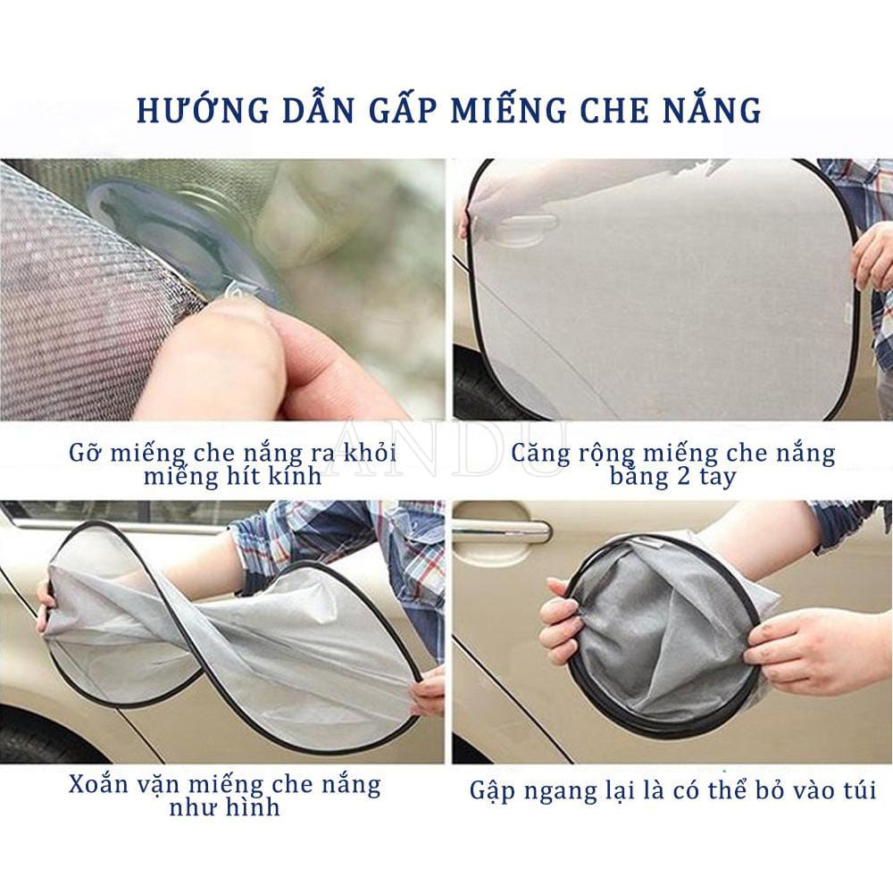 Trọn Bộ chống nắng Ô TÔ gồm : 1 túi đựng tráng bạc ,1 Miếng mặt trước :150cm x 70 cm ,1 Miếng mặt sau : 100cm x 49 cm , 2 Miếng cửa trước : 65cm x 37 cm,2 Miếng cửa sau : 51cm x 37 cm, 12 núm hút cao su ,Chất liệu :Vòng thép không gỉ , vải tráng bạc,bền – đẹp – chắc chắn