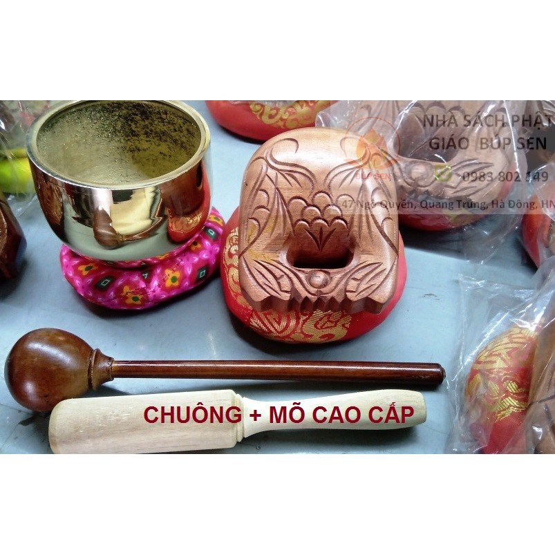 Chuông đồng, mõ gỗBộ sản phẩm gồm: 1 chuông + 1 đế vải để chuông + 1 tay đánh chuông