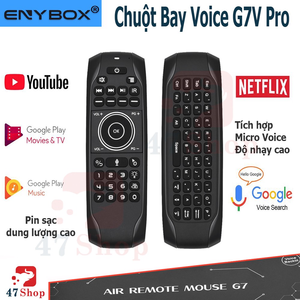 Chuột bay tìm kiếm giọng nói G7v Pro là điều khiển sử dụng cho các dòng Android TV Box phổ thông hiện nay trên thị trường. Ngoài ra, G7v Pro còn có thể tương thích với HĐH Windows và một số HĐH khác.