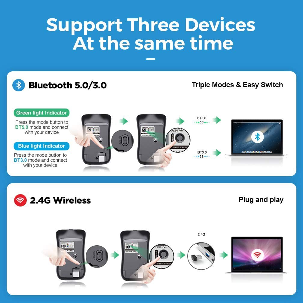 ✔ Kết nối ba chế độ: Kết nối Bluetooth 5.0 / 3.0 và USB 0.08 oz vô hình. Bạn có thể chuyển sang bất kỳ chế độ nào bằng cách nhấp vào nút chuyển đổi chế độ ở cuối chuột. Đèn chỉ báo cho Bluetooth 5.0, Bluetooth 3.0 và USB 0.08 oz lần lượt là xanh lục, xanh lam và đỏ. Sau khi hoàn tất việc ghép nối Bluetooth hoặc cắm USB, bạn có thể tự do chuyển sang từng chế độ và khoảng cách hoạt động tối đa của mỗi chế độ là 32,8ft.