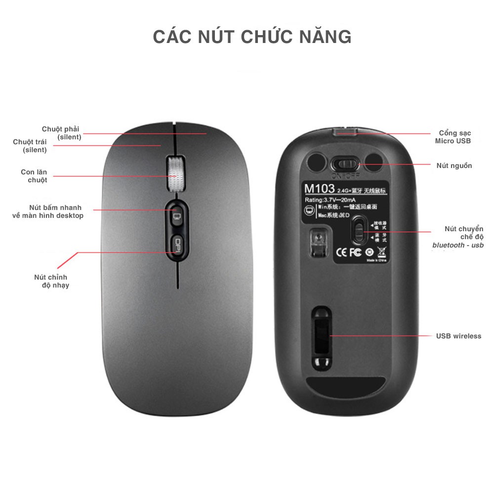 Chuột Bluetooth cho macbook Ipad Laptop M103 pin sạc vừa hỗ trợ kết nối qua USB wireless, vừa kết nối qua chế độ Bluetooth nên tương thích với hầu hết các thiết bị laptop, smartTV, máy tính PC, máy tính bảng, điện thoại (Có thể kết nối với cả Iphone, Ipad, điện thoại Android).