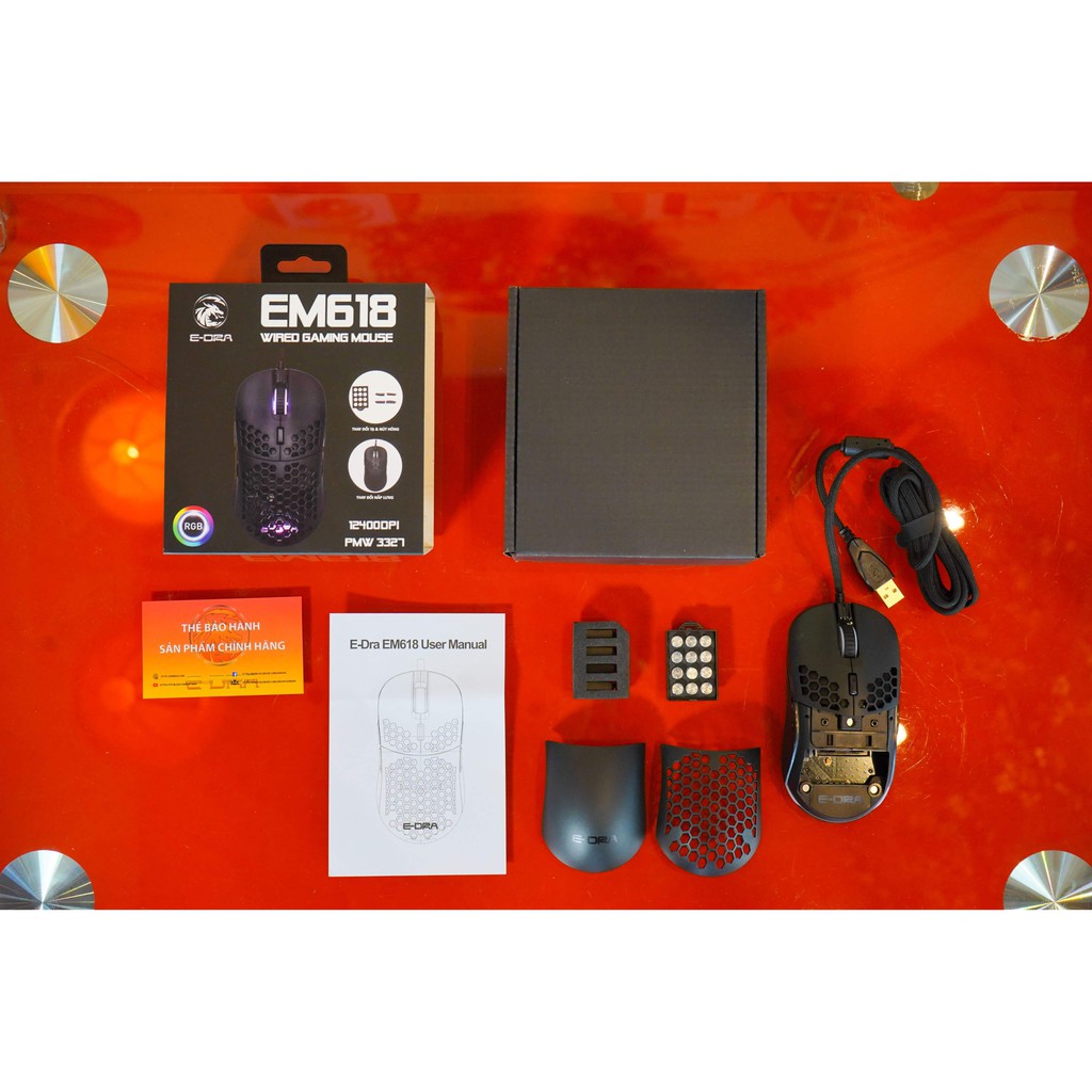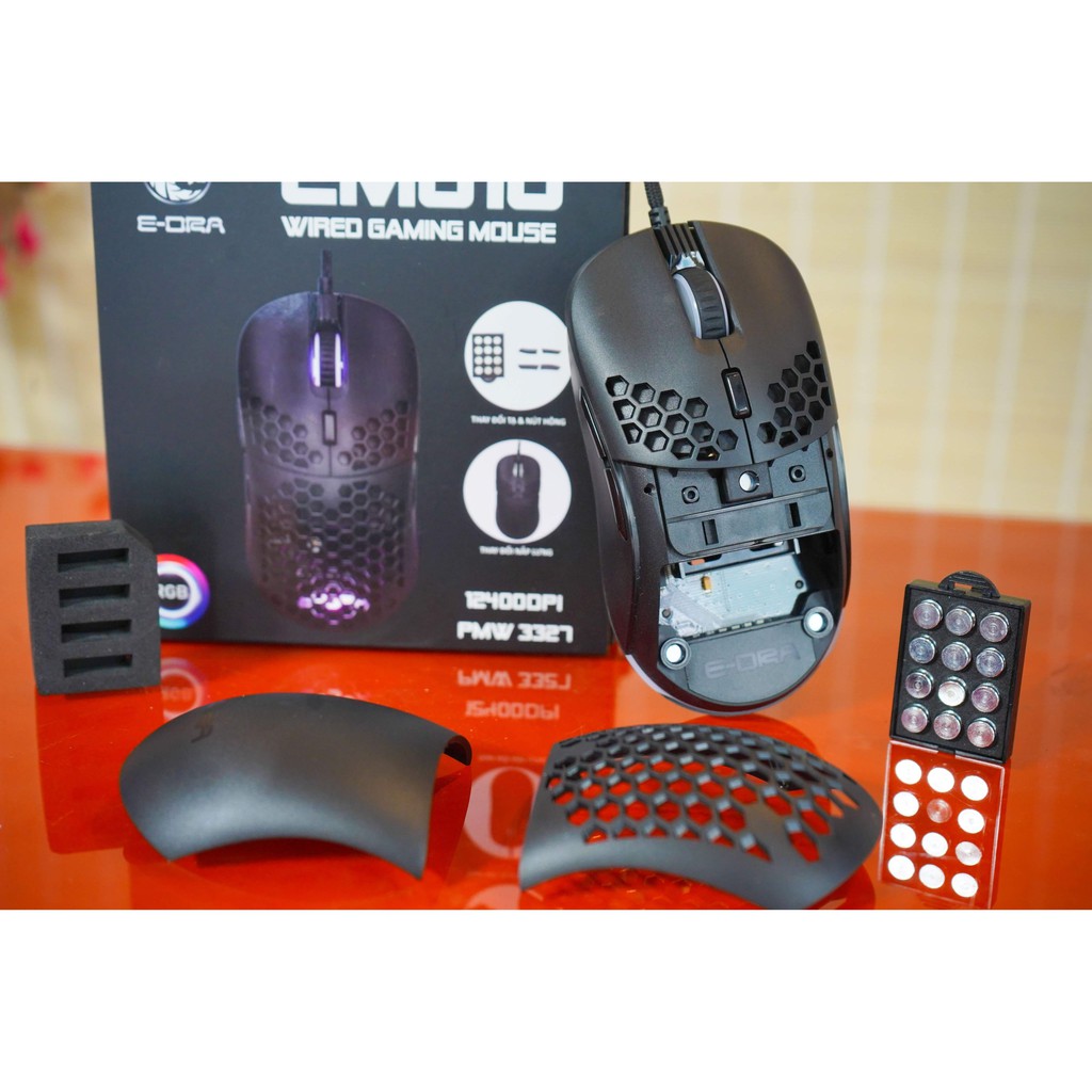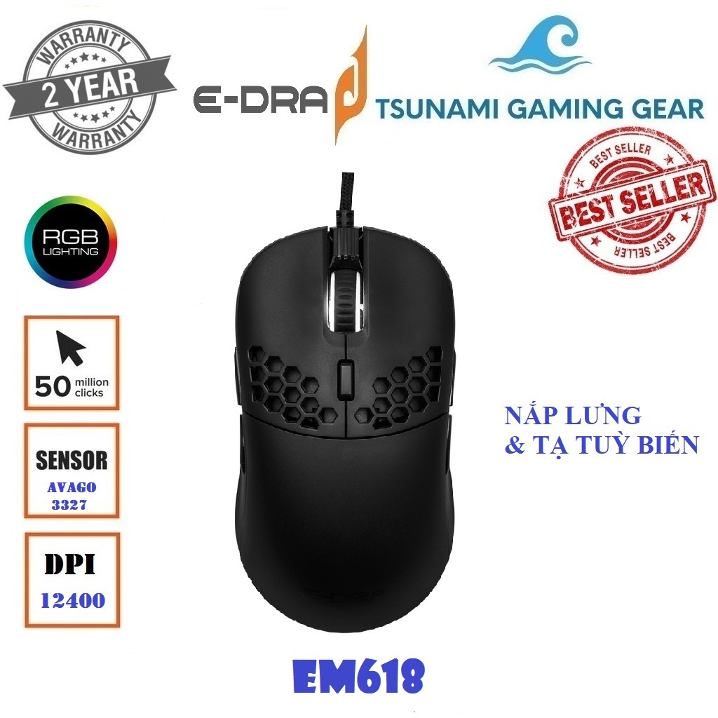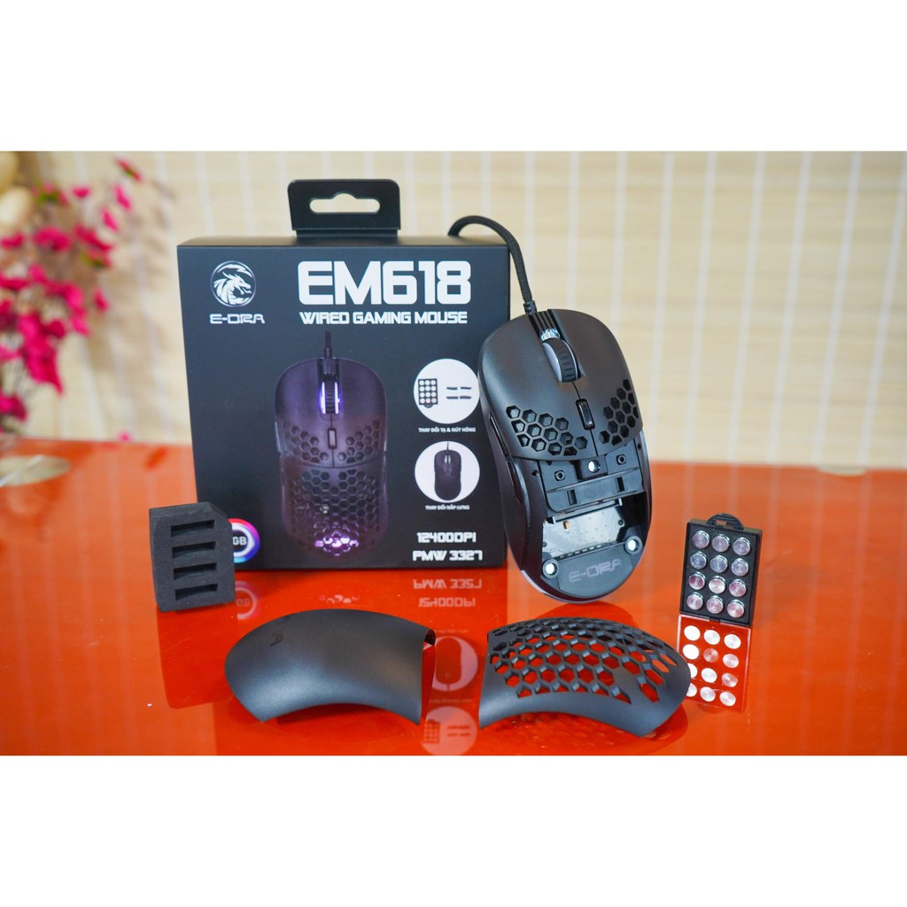 Máy tính & Laptop > Chuột & Bàn Phím > Chuột Máy Tính || Chuột gaming E-Dra EM618 RGB, Avago 3327, DPI 12400, thay nắp lưng và tạ tùy biến - Hàng chính hãngCòn hàng