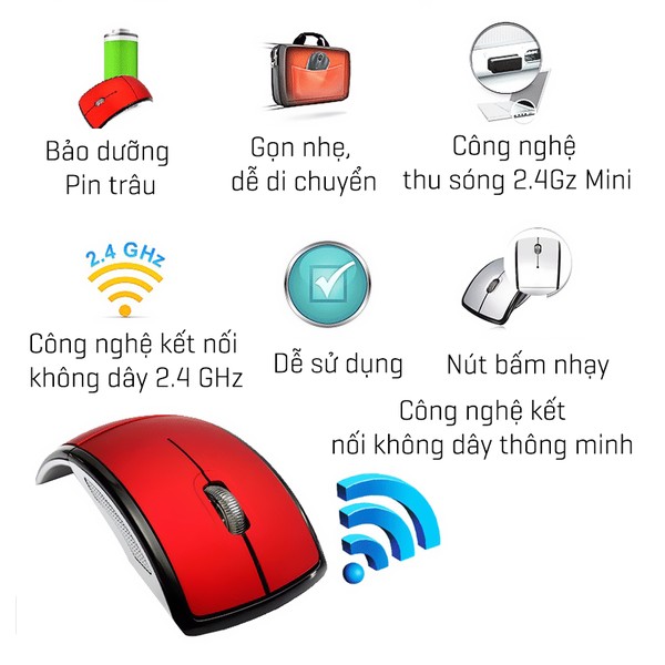 • Chuột gấp không dây phát sóng thông qua kết nối không dây USB 2.4 GHz. Với kết nối này, chuột có khả năng hoạt động trong khoảng cách lên tới 10m.