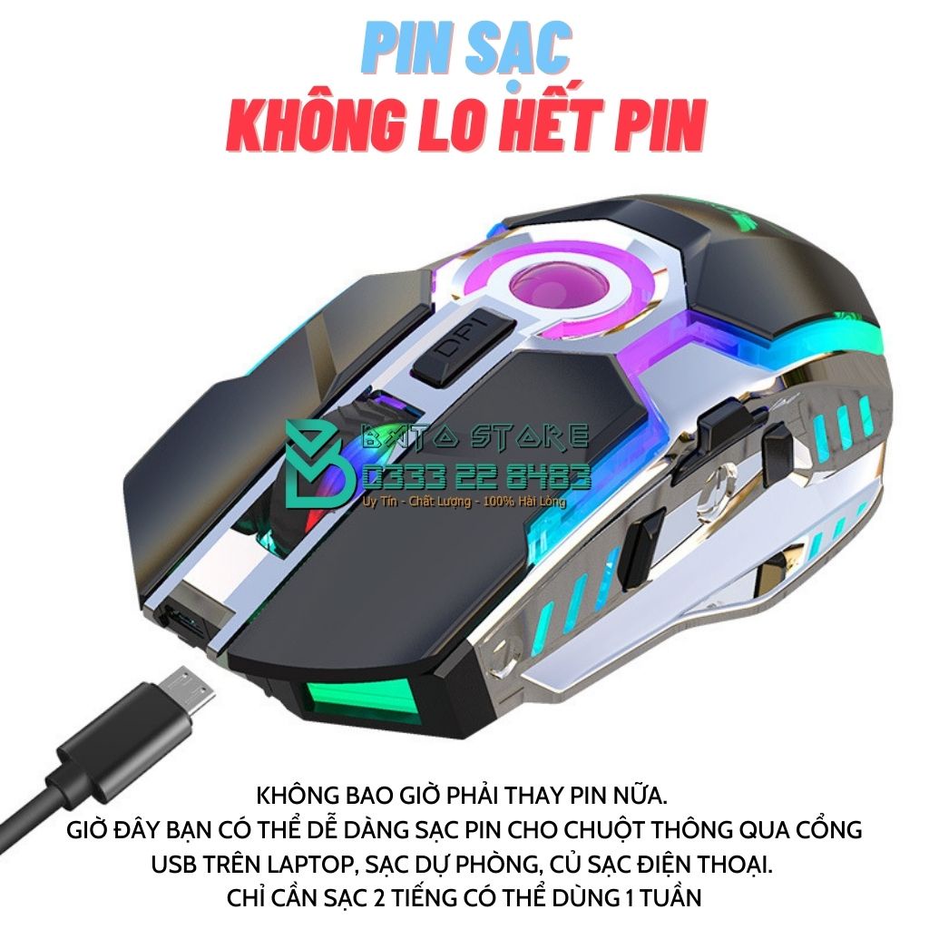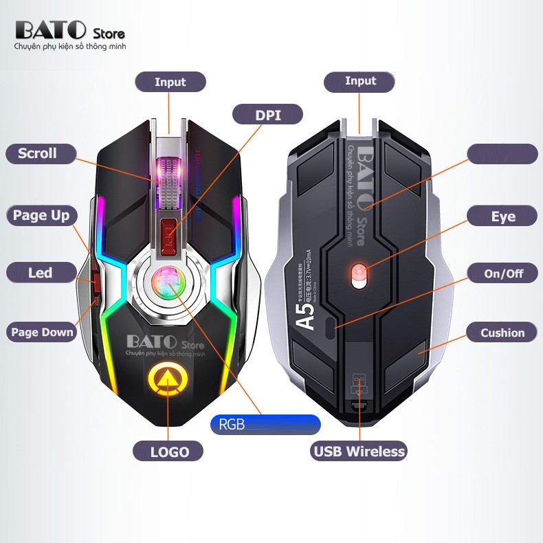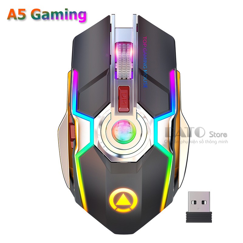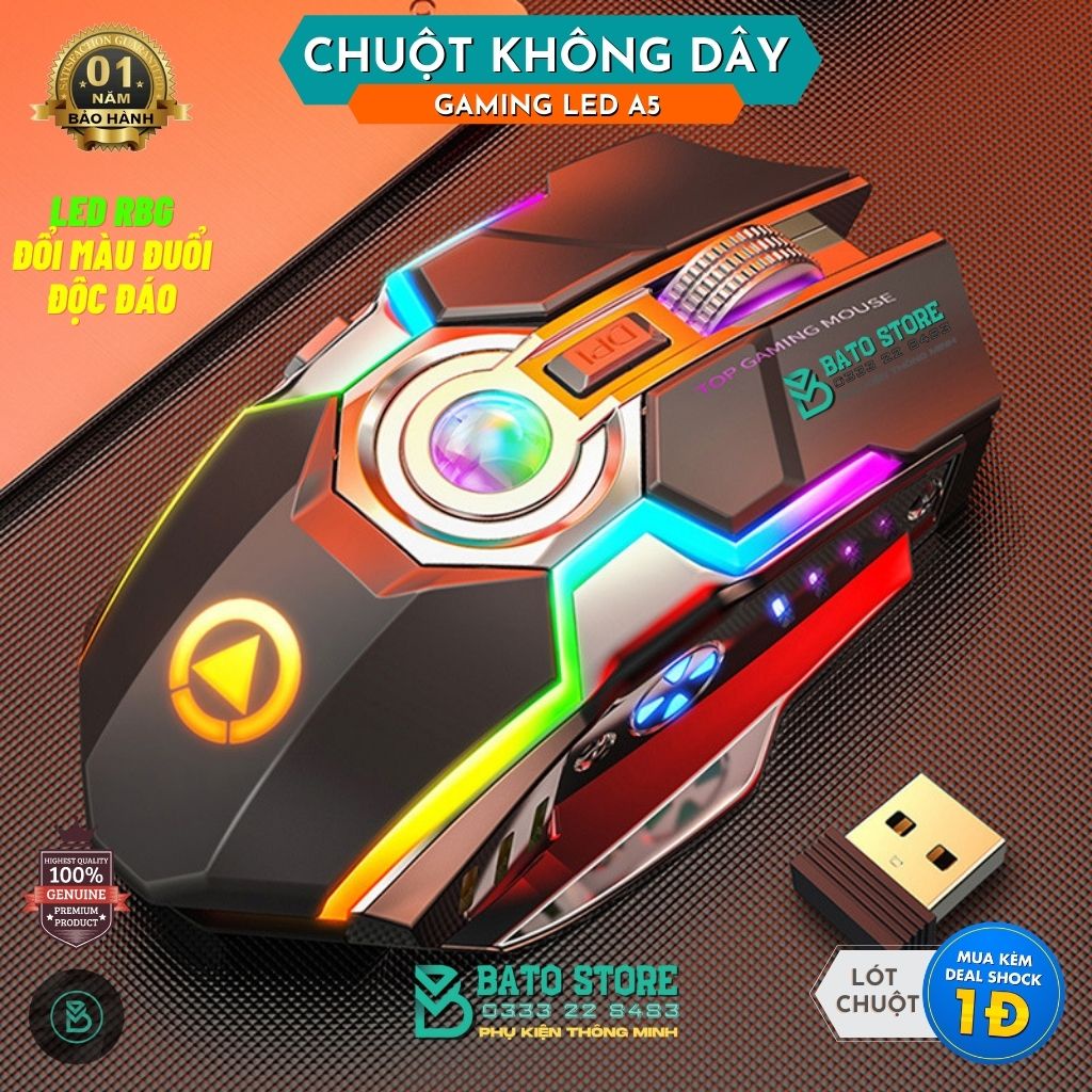 Chuột không dây A5Pro chuột gamming Led đổi màu nhiều hiệu ứng, Pin Sạc, Fullbox, 7 phím gamming - Cực đẹp - Cực ĐộcBATO Store là đơn vị phân phối và bảo hành độc quyền sản phẩm, 1 đổi 1 nếu lỗi 7 ngày, bảo hành 12 tháng chính hãng.