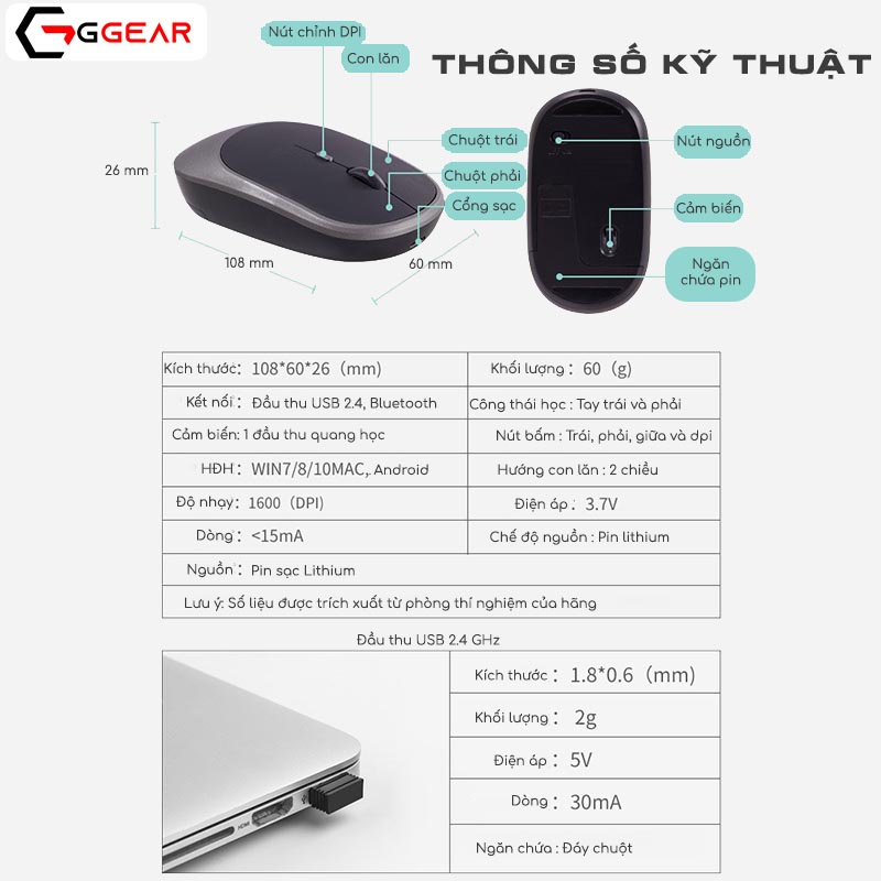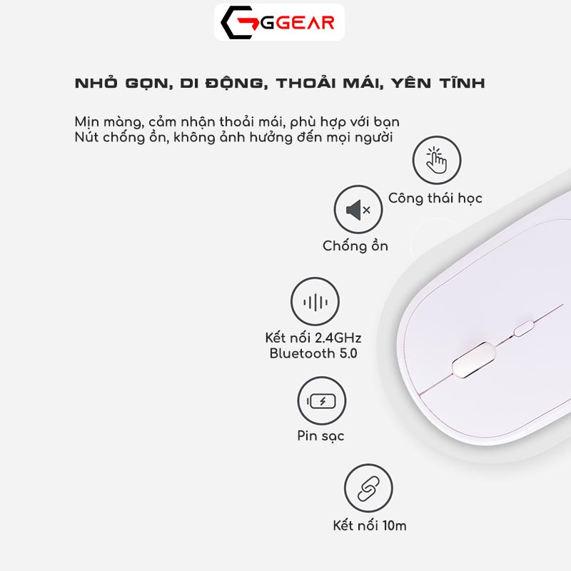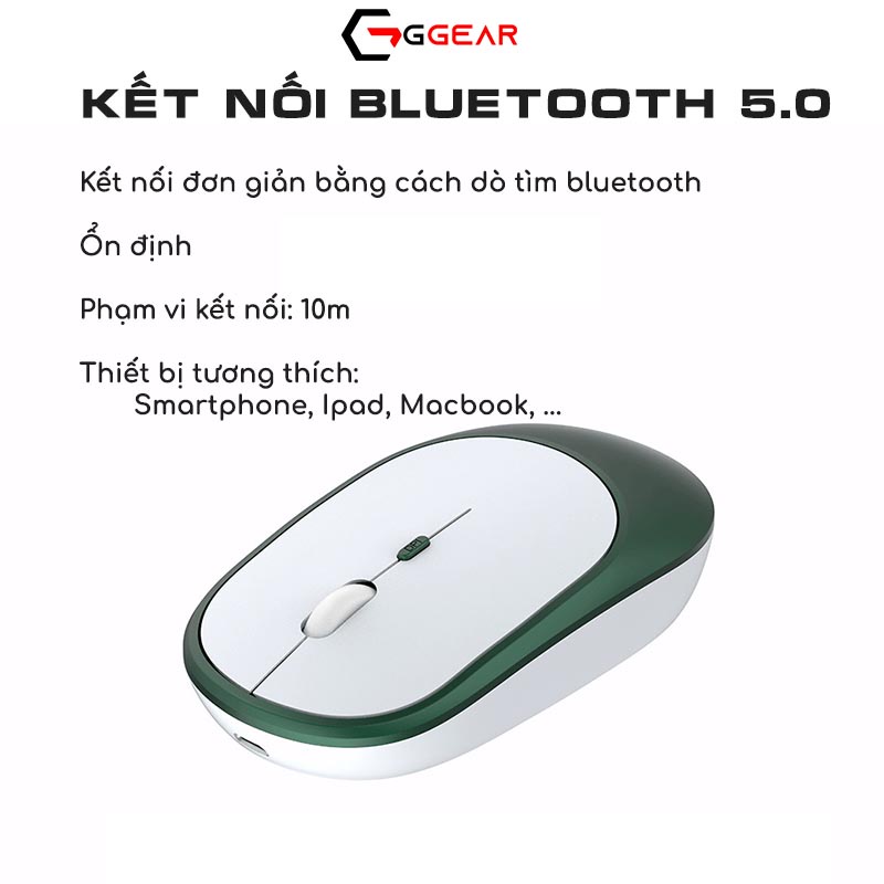 Ngoài hai loại chuột trên, Ggear còn cung cấp một loại chuột kết hợp hai kiểu kết nối, bluetooth + 2.4G, do đó rất đa năng. Vừa có thể dùng smartphone, macbook, ipad, … vừa có thể kết nối với laptop, pc, tv qua đầu thu USB 2.4G.