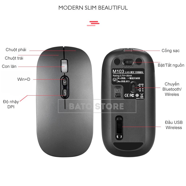 Chuột Không dây Bluetooth/ Wireless M103 Pin Sạc Dùng Cực Lâu 1 Tháng, Click Siêu Êm Không Tiếng, 1600DPI - Kèm cáp sạcTHÔNG SỐ KỸ THUẬT: