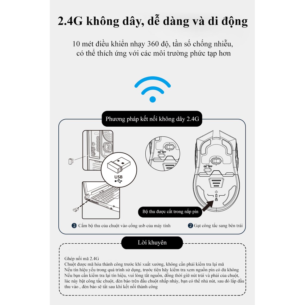 Tiết kiệm điện năng thông minh: Chuột tự động ngủ, đánh thức thông minh. Công tắc Tắt / Mở cũng được cung cấp để tắt nguồn tự động