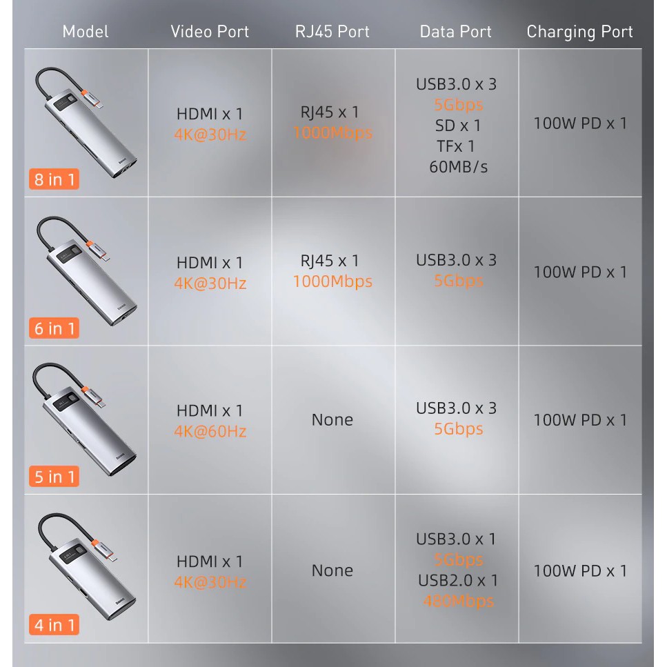 - 8 in 1: HDMI, USB3.0*3, RJ-45, SD, TF, Type C (PD100W)
