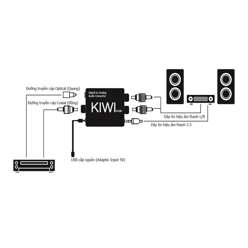 Chuyển đổi âm thanh từ Optical, Coaxial, AUX, USB, Bluetooth ra âm thanh Stereo (L-R) ra loa, amply.