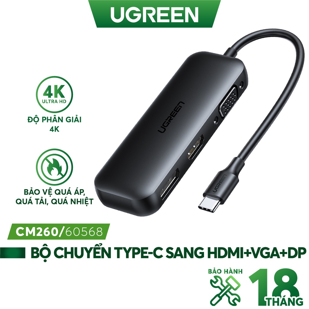 - Ugreen 60568 Bộ chuyển đổi USB Type-C sang HDMI+VGA+DP vỏ nhôm màu đen CM260 10060568