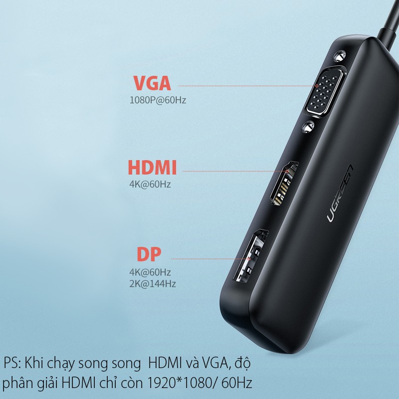 Bộ chuyển đổi đa năng UGREEN 60568 - Chuyển đổi Type-C sang HDMI + VGA + DP - Vỏ hợp kim - Hàng phân phối chính hãngTHỜI GIAN GIAO HÀNG SIÊU TỐC ĐỘ