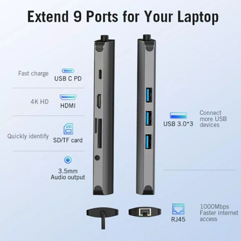Máy tính & Laptop > Thiết Bị Lưu Trữ > USB & OTG || Bộ chuyển đổi Hub 9 in 1 USB Type C to sang HDMI 4K USB3.0 TF RJ45 Vention Ravpower Aukey cho Samsung dex Macbook LaptopCòn hàng