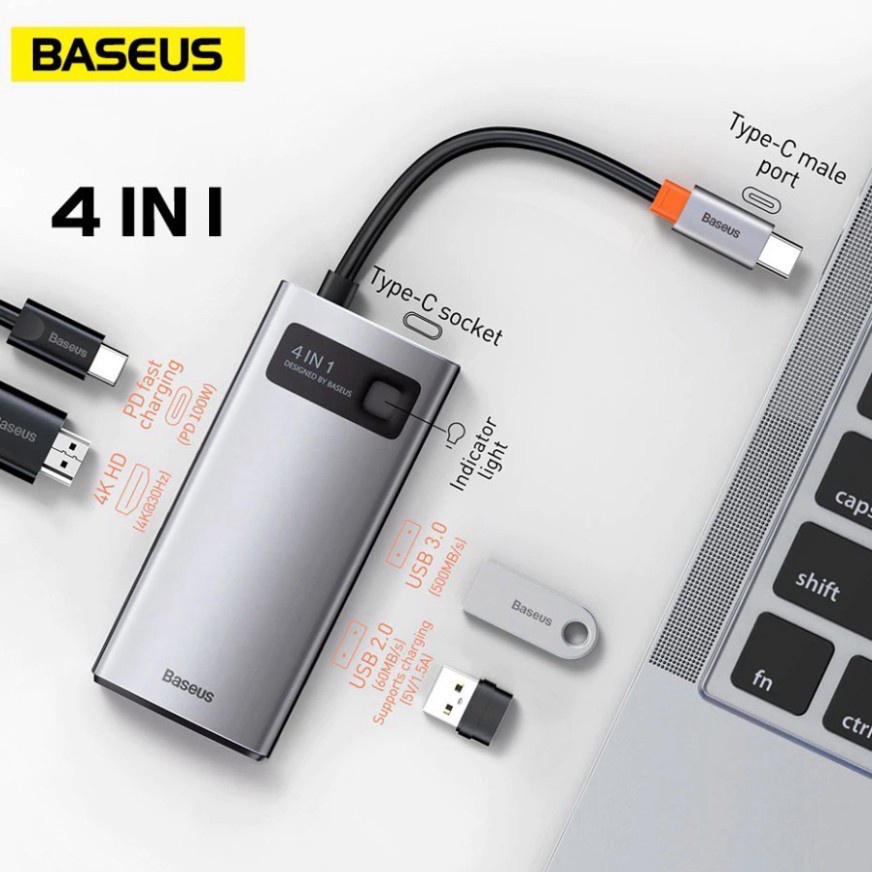 Máy tính & Laptop > Phụ Kiện Máy Tính > Bộ chia cổng USB & Đọc thẻ nhớ || Bộ chuyển đổi hub baseus 4 in 1 typec to hdmi 4k usb 3.0 usb 2.0 pd 100w cho laptop macbook chính hãng baseusCòn hàng