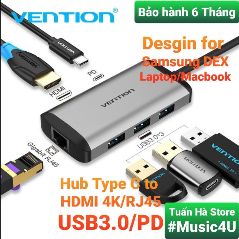 Bộ cáp chuyển đổi Hub 6 in 1 USB Type C to sang HDMI 4K USB3.0 PD RJ45 Vention Ravpower Aukey cho Samsung dex Macbook
