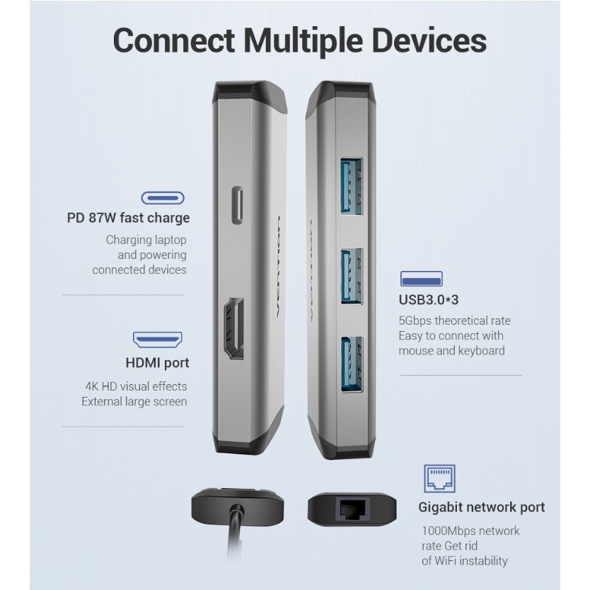 Máy tính & Laptop > Phụ Kiện Máy Tính > Bộ chia cổng USB & Đọc thẻ nhớ || Bộ cáp chuyển đổi Hub 6 in 1 USB Type C to sang HDMI 4K USB3.0 PD RJ45 Vention Ravpower Aukey cho Samsung dex MacbookCòn hàng