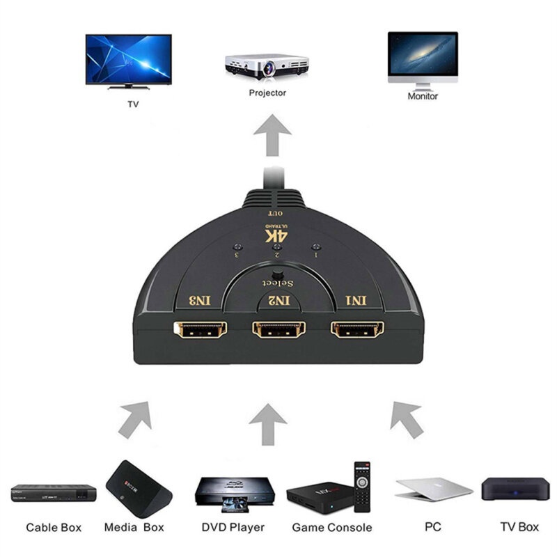 Bộ chuyển đổi Switch HDMI 4k hỗ trợ từ 3x1 hỗ trợ 3 ngõ vào như DVD, Android box, PC và 1 ngõ ra cổng HDMI xuất LCD tivi