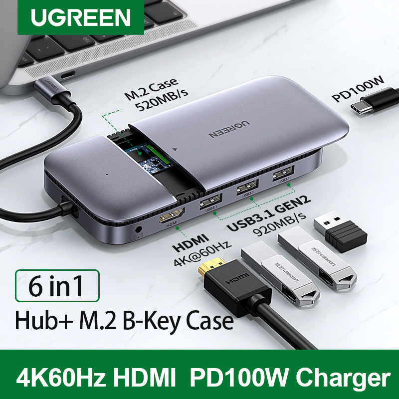 Máy tính & Laptop > Thiết Bị Lưu Trữ > USB & OTG || Bộ chuyển đổi USB Type-C 6 in 1 Ugreen 70449 Chính Hãng HDMI 4K@60Hz+USB 3.1 Gen 2 + PD + DC 5V/ 2A + M.2 SATA B-KeyCòn hàng