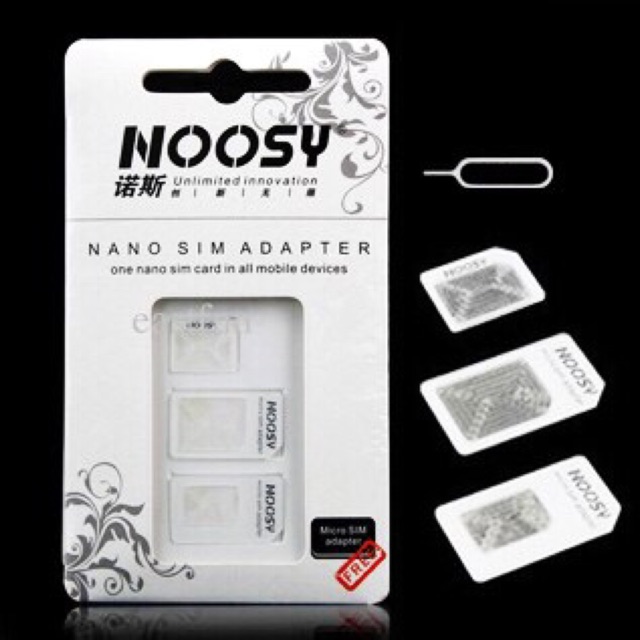 BỘ CHUYỂN ĐỔI SIM ĐA NĂNG NOOSY + CÂY CHỌT SIMBộ chuyển đổi sim đa năng Noosy gồm 3 khay: khay thay Nano SIM thành Micro SIM, khay thay Nano SIM thành SIM thường và khay thay Micro SIM thành SIM thường giúp Nano SIM dành riêng cho iPhone 5 có thể sử dụng được với iPhone 4 và các loại điện thoại thông thường khác.
