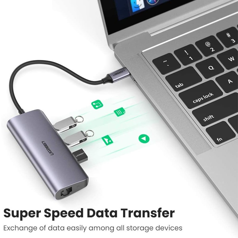 Bộ chia Ugreen 60718 có 3 cổng USB 3.0 để đồng bộ nhanh: Bộ chuyển đổi ethernet hub USB C hỗ trợ siêu tốc độ lên đến 5 Gbps, truyền một bộ phim HD trong vài giây. 3 cổng USB 3.0 Hub bổ sung đơn giản giúp kết nối nhiều phụ kiện hơn như chuột, bàn phím, Ổ đĩa ngoài, Ổ đĩa ngón tay cái với cổng USB A truyền thống, hỗ trợ đồng bộ hóa dữ liệu lên đến 5Gbps, biến nó trở thành Hub Loại C rất thiết thực và hữu ích cho bạn, hoàn hảo để sử dụng hàng ngày.