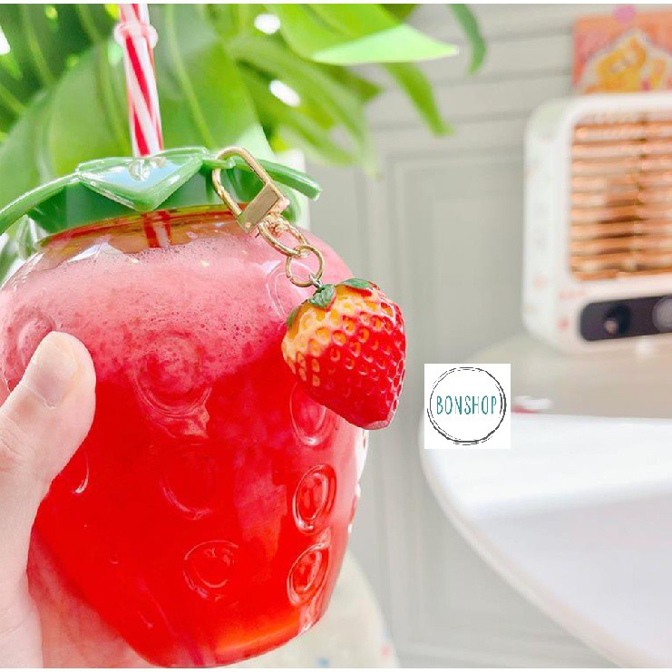 Chai nhựa trái Dâu Tây xinh xắn đựng trà sữa và nước trái cây, có nắp lỗ cắm ống hútChai không kèm Charm và ống hút